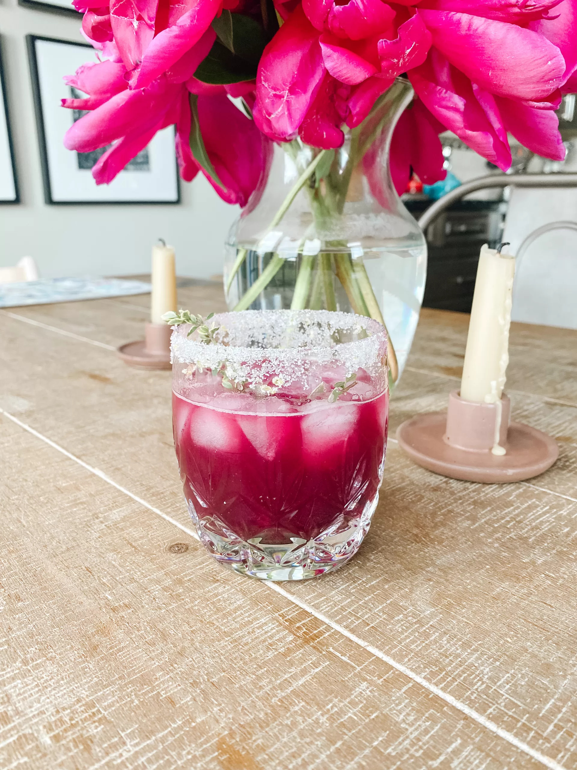 - To make the lemon sugar. Combine the lemon zest, sugar, and thyme on a shallow plate. Rim your glasses in sugar, then fill with ice.