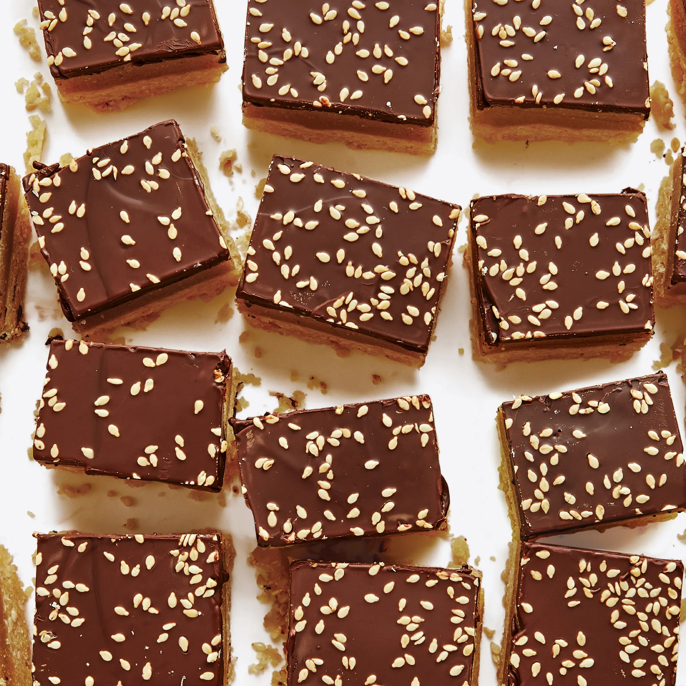 - Remove from heat, add ½ cup tahini and 1 tsp. vanilla extract and whisk until incorporated and smooth. Pour butterscotch over shortbread and tilt pan to distribute evenly if necessary. Chill until set, 30–40 minutes.
