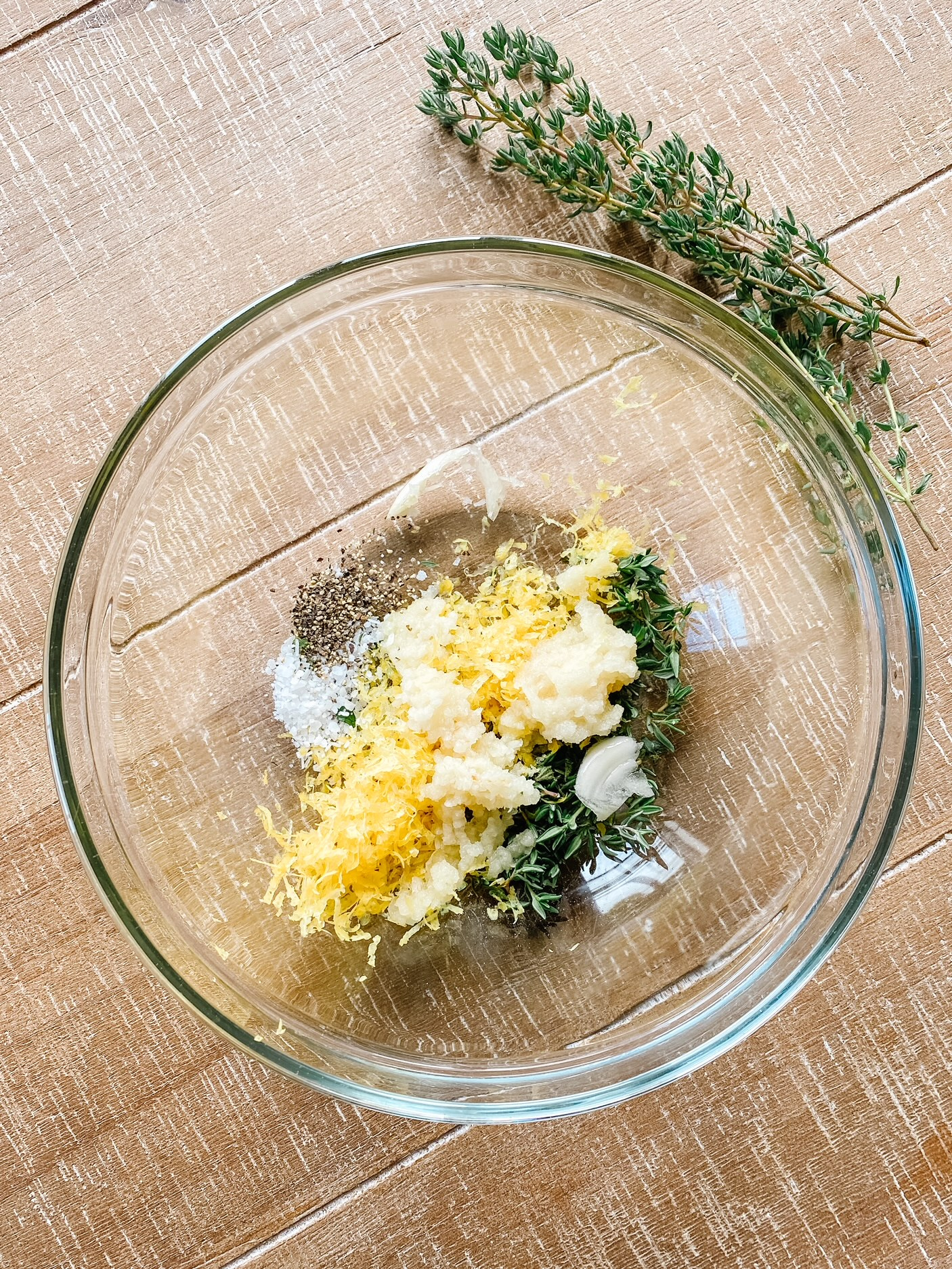 - In a small bowl, combine butter with 1 tbsp (15 mL) of thyme, oregano, lemon zest, 1/2 tsp (2 mL) salt, 1/4 tsp (1 mL) black pepper and the grated garlic. Stir to combine.