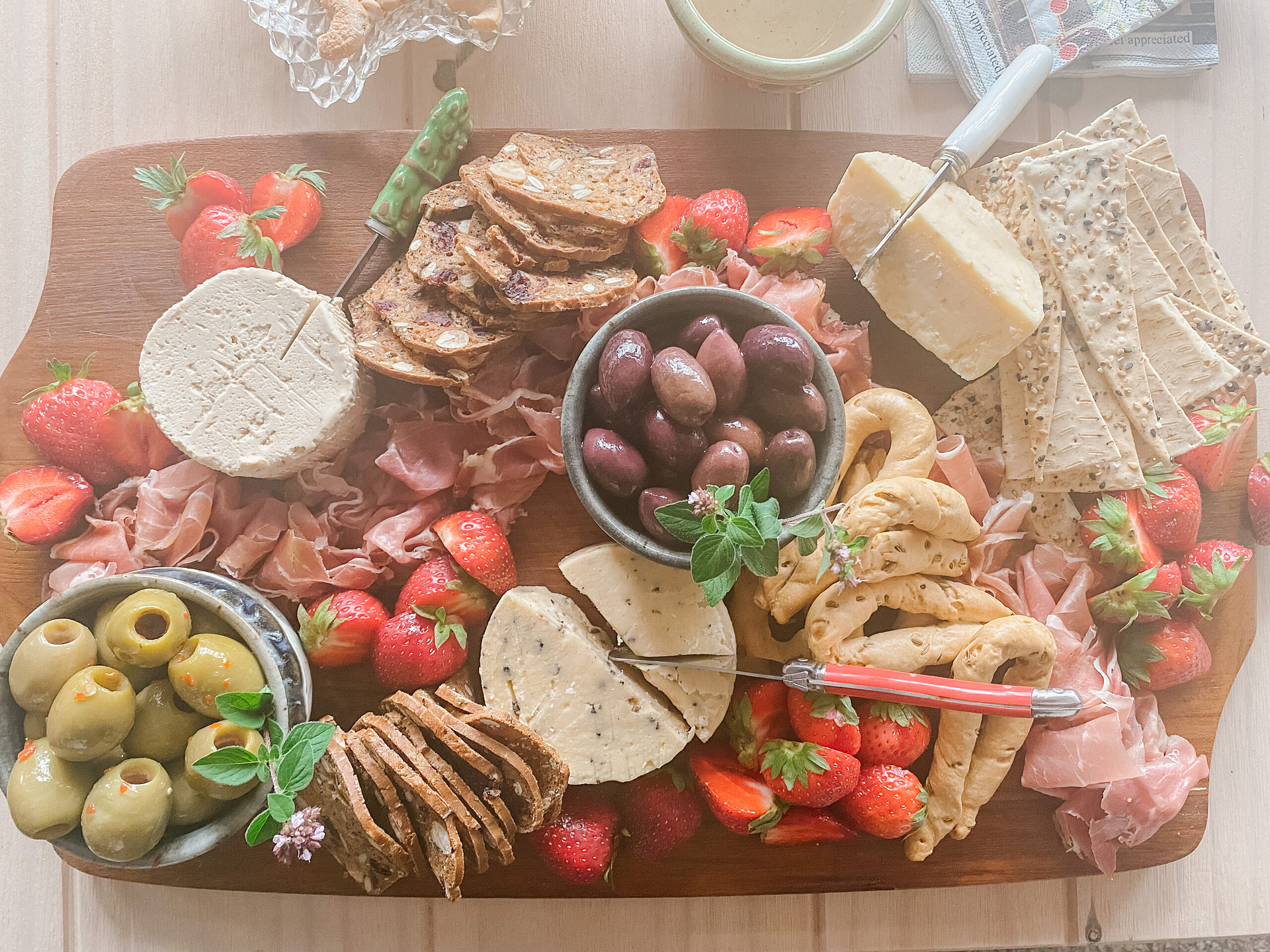 - If there is space I put baguette, crackers and bread sticks on the board as well but usually I don’t have space and just include them in a basket on the side. In my opinion breads are not an absolute must for a board but I know they are usually expected.