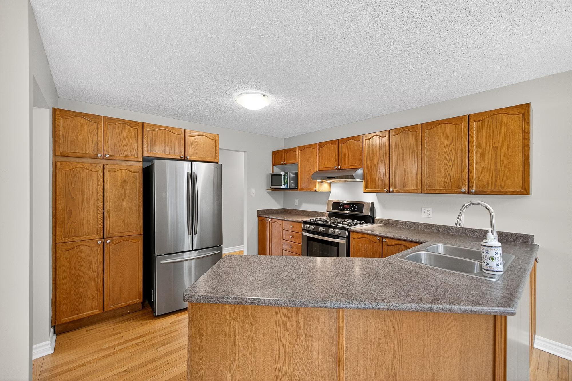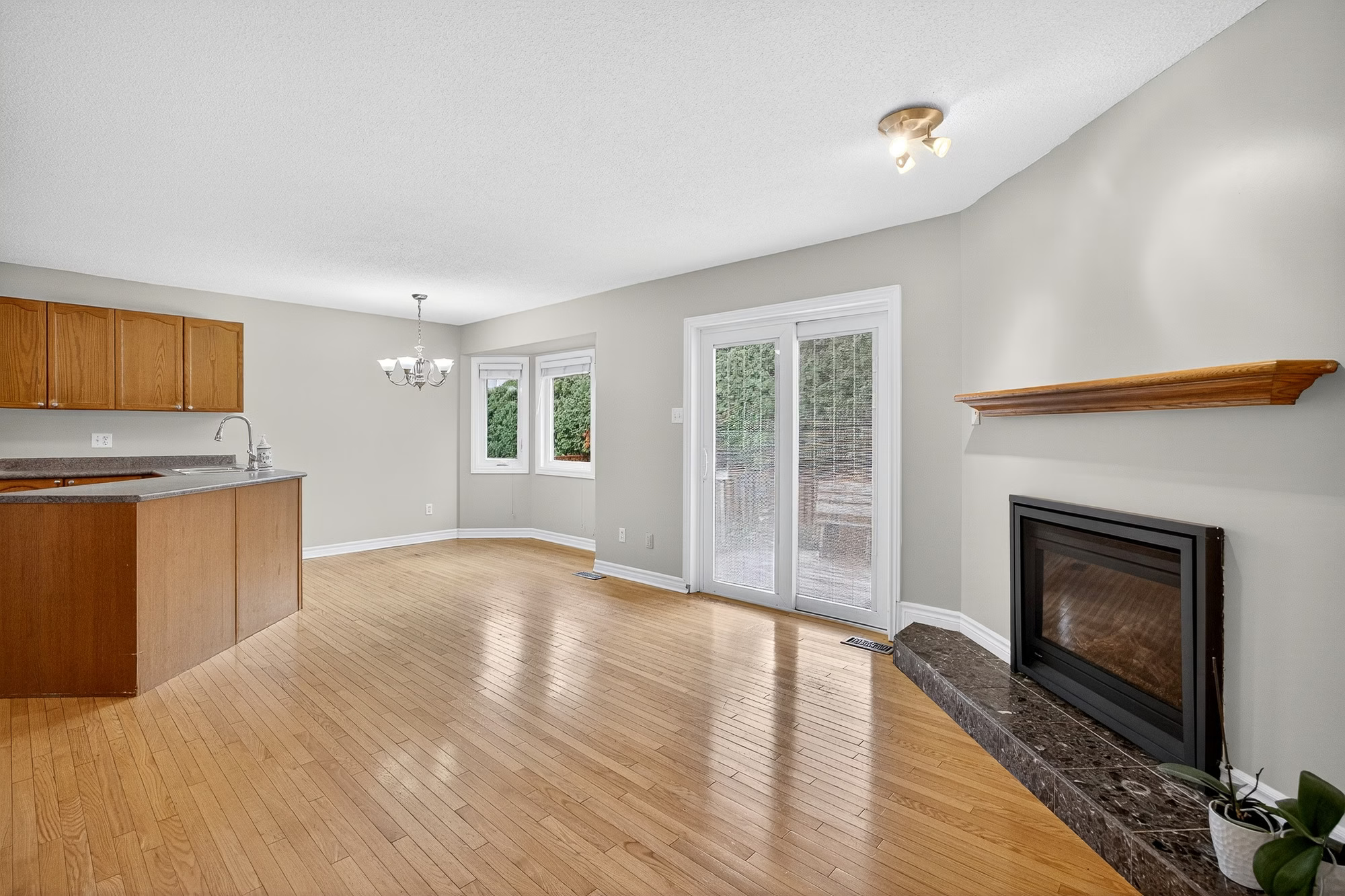 The functional kitchen also offers hardwood flooring, space for an eating area and is open to the main floor family room with new gas fireplace.