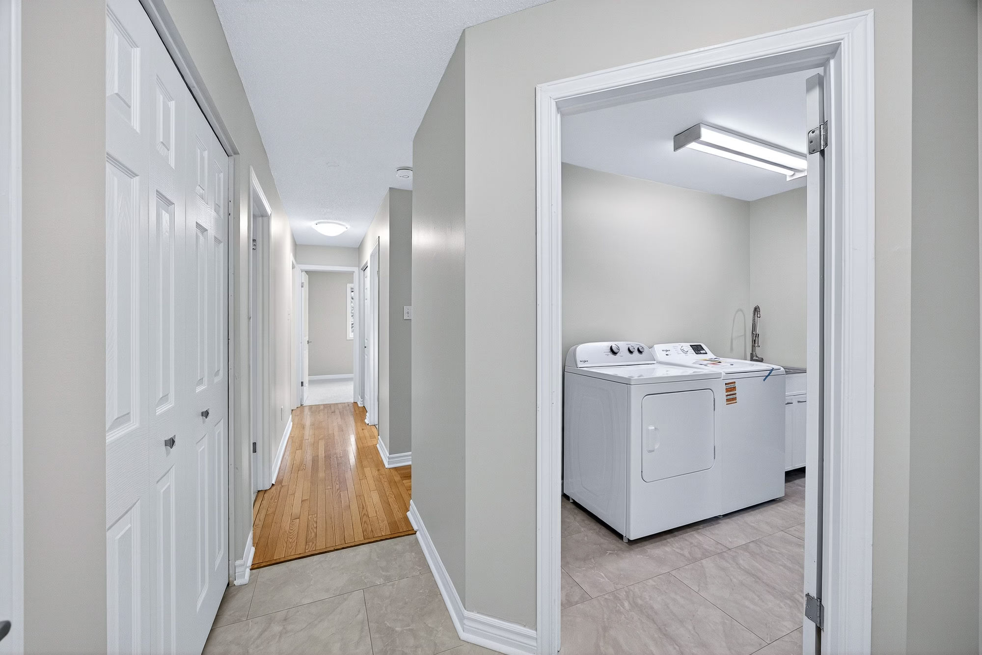 Main floor laundry with access to the garage has new flooring plus a brand new washer and sink and the dryer is less than a year old!