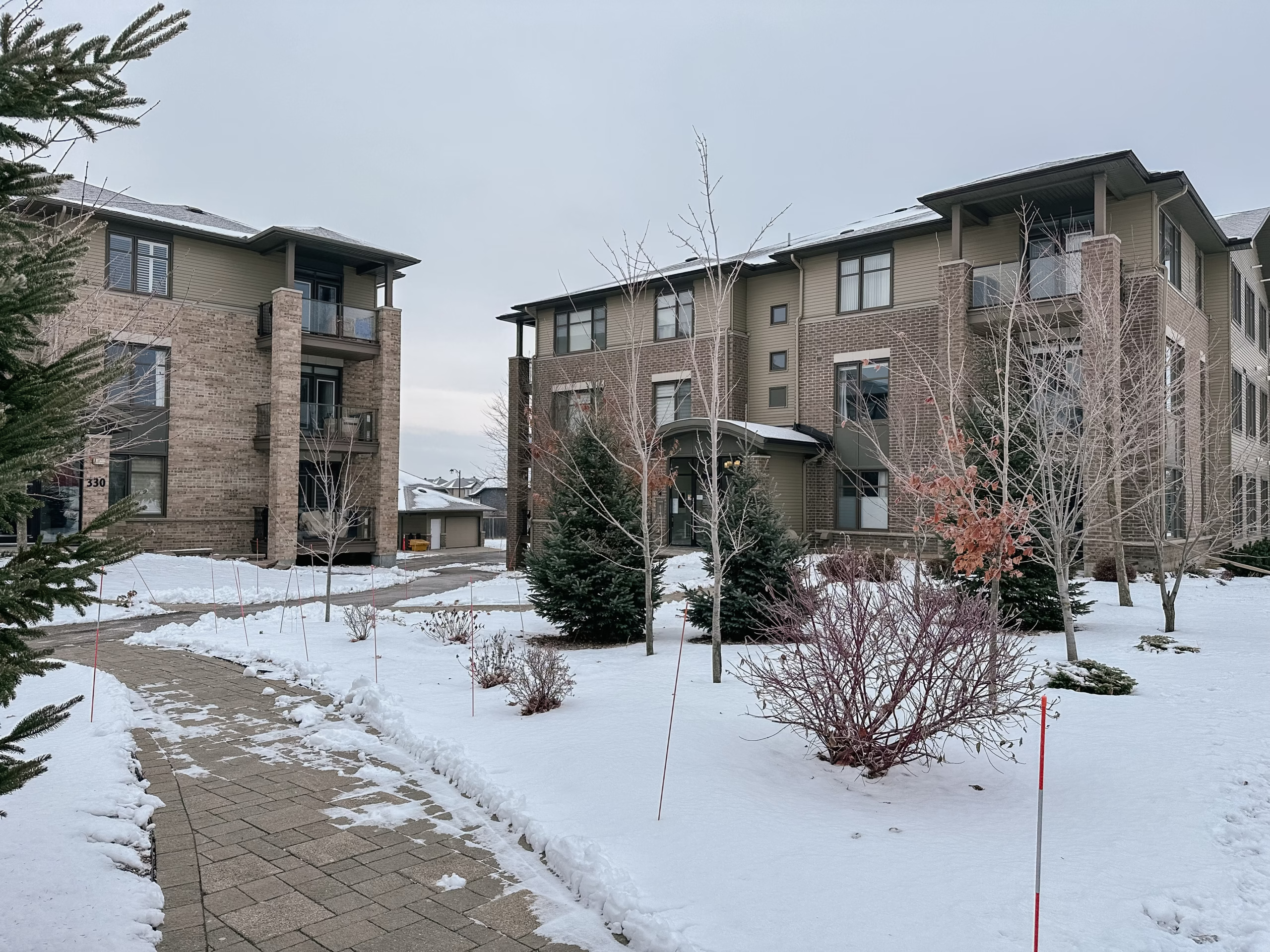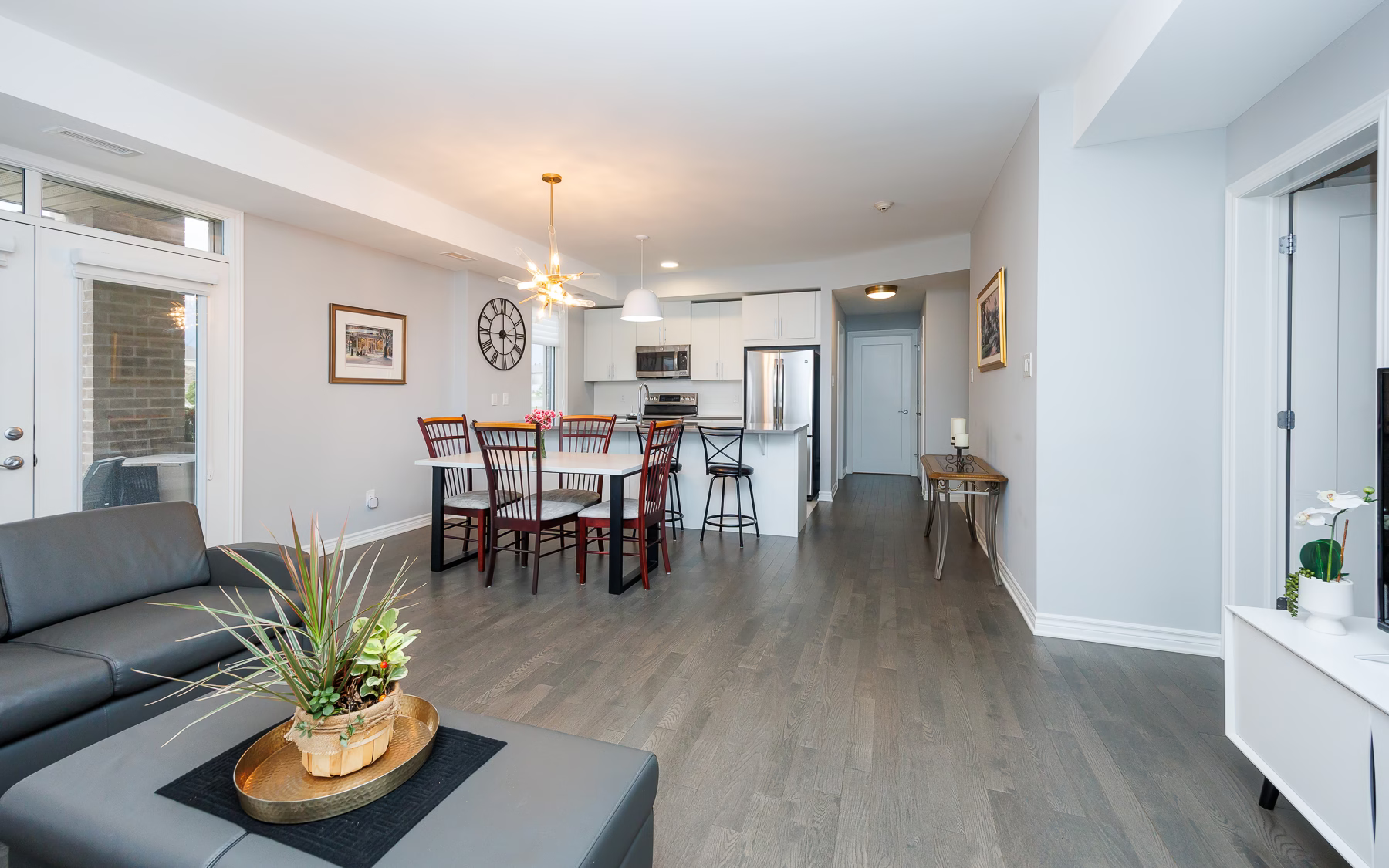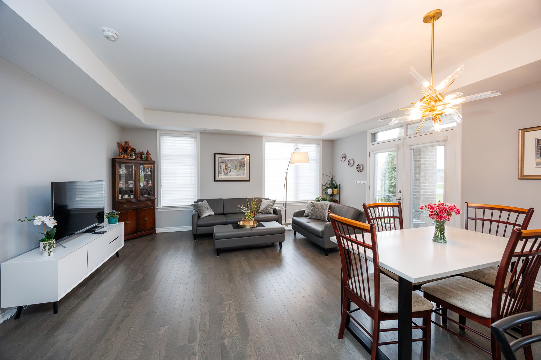 Tasteful hardwood floors are through the open concept living space with access to your outdoor patio with immediate access to grass and walking – perfect for those with pets! Upgraded kitchen with quartz countertops, soft close cabinetry and stainless steel appliances. The den also has hardwood flooring and is the perfect spot for an office and/or reading/media area. The primary bedroom offers a walk-in closet and 3 piece ensuite. The second bedroom is right next to the 4 piece main bath.