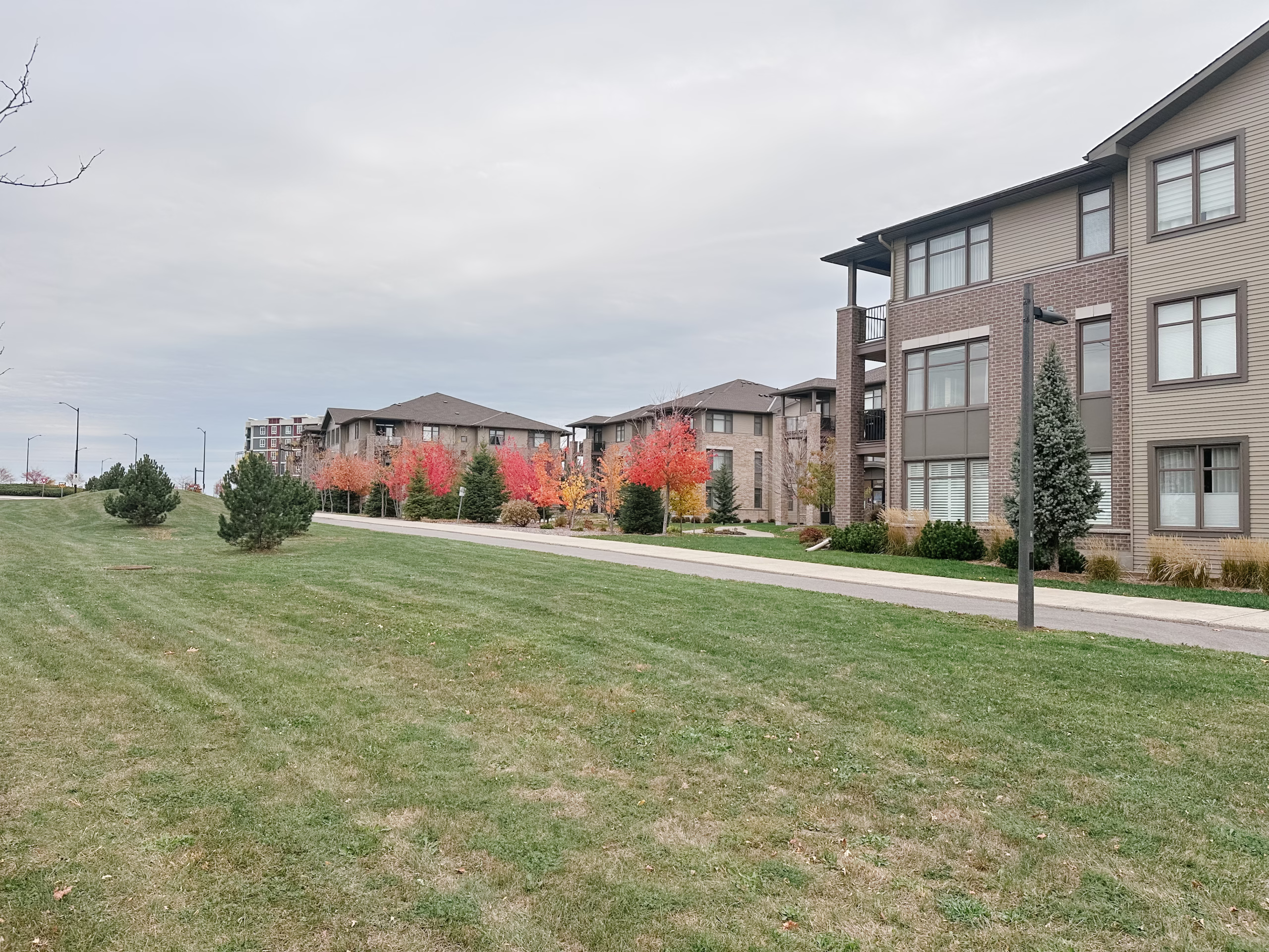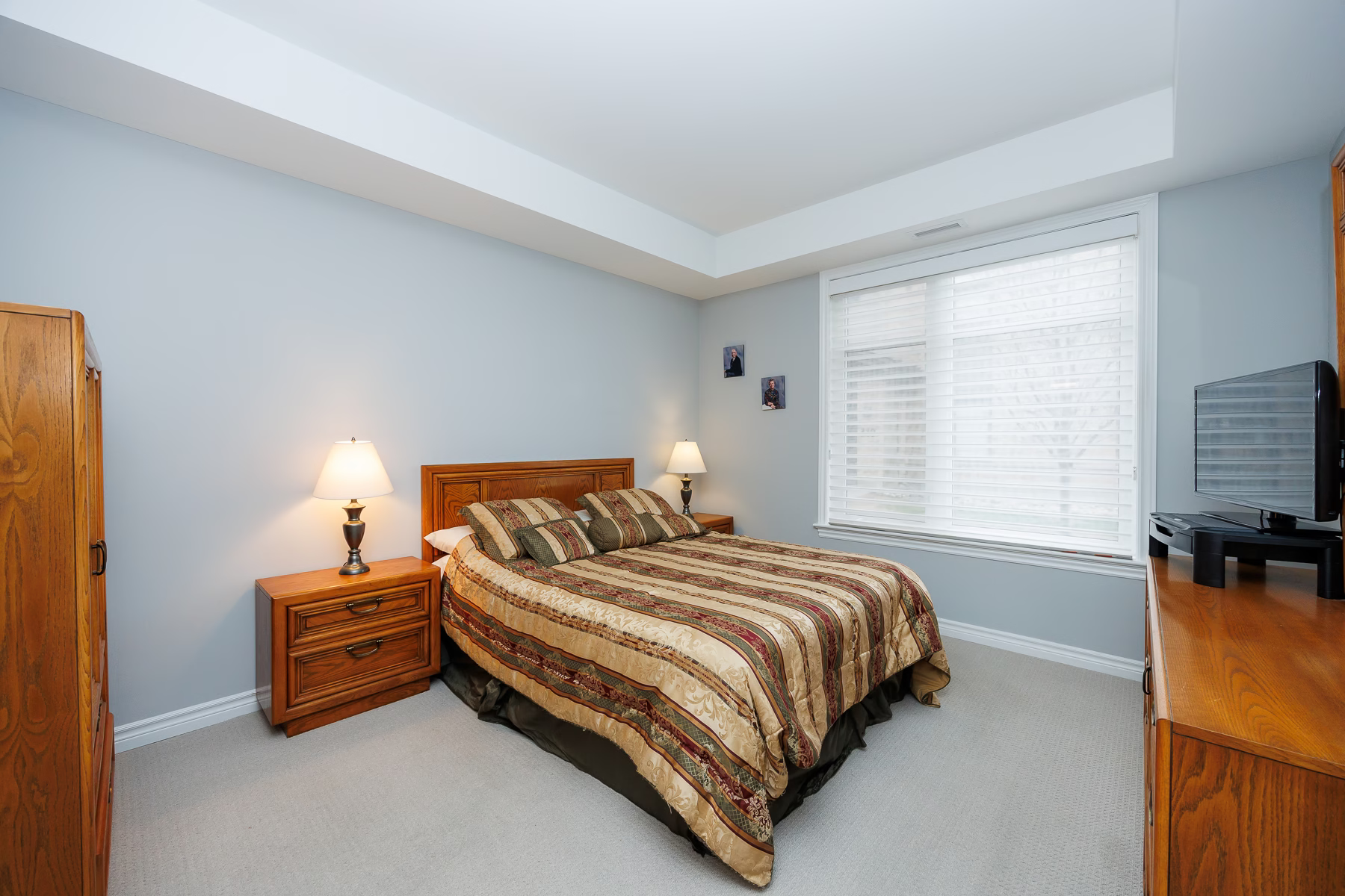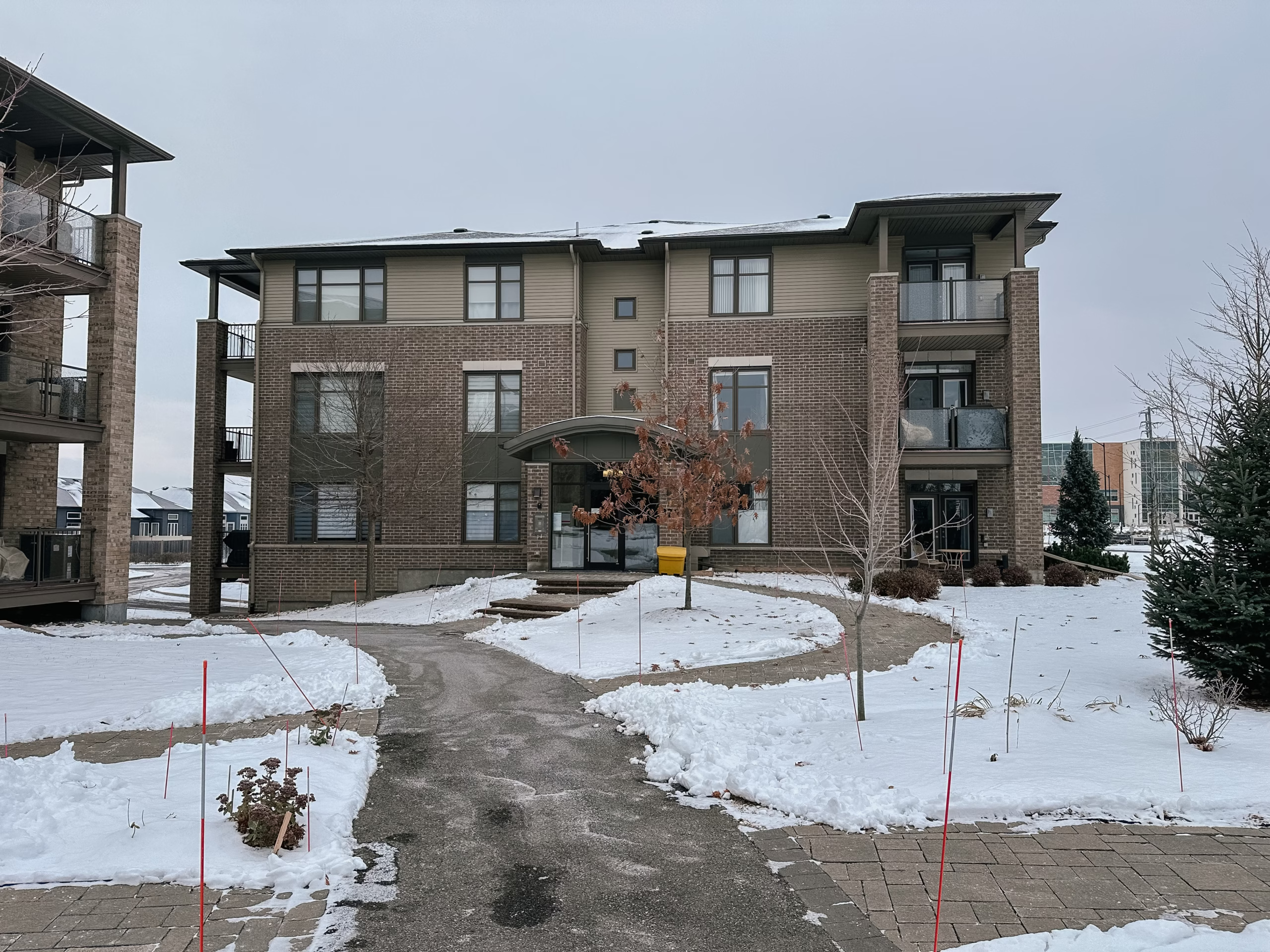 Tasteful hardwood floors are through the open concept living space with access to your outdoor patio with immediate access to grass and walking – perfect for those with pets! Upgraded kitchen with quartz countertops, soft close cabinetry and stainless steel appliances. The den also has hardwood flooring and is the perfect spot for an office and/or reading/media area. The primary bedroom offers a walk-in closet and 3 piece ensuite. The second bedroom is right next to the 4 piece main bath.